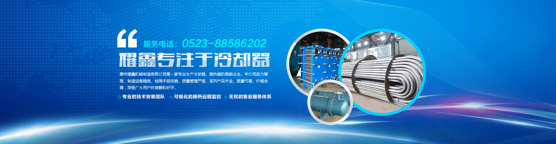 免費(fèi)咨詢方案 +泰州耀鑫機(jī)械制造有限公司座落于風(fēng)景如畫的江蘇魚米之鄉(xiāng)--全國文明城鎮(zhèn)婁莊鎮(zhèn),是一家專業(yè)生產(chǎn)風(fēng)冷卻器、列管式冷卻器、板式冷卻器的企業(yè)。本公司實(shí)力雄厚、制造設(shè)備精良、檢測手段完善、質(zhì)量管理嚴(yán)密、系列產(chǎn)品齊全、質(zhì)量可靠、價(jià)格合理,深受廣大用戶的信賴和好評。